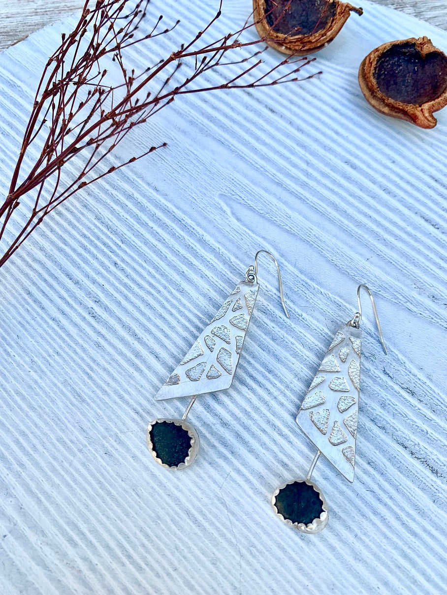 Etched silver earrings with black stone. The shape and color contrast of silver against black makes them truly elegant. Long and modern earrings that are truly one of a kind.
