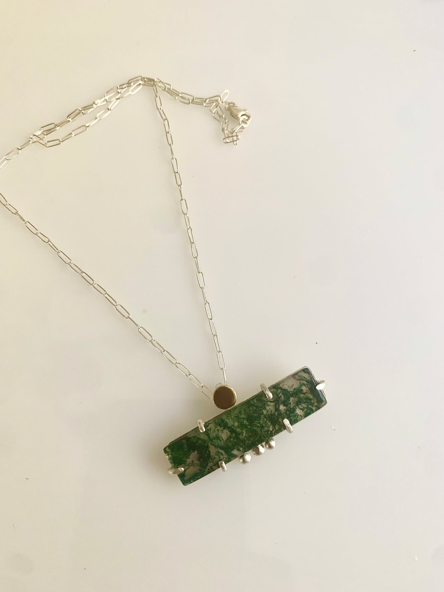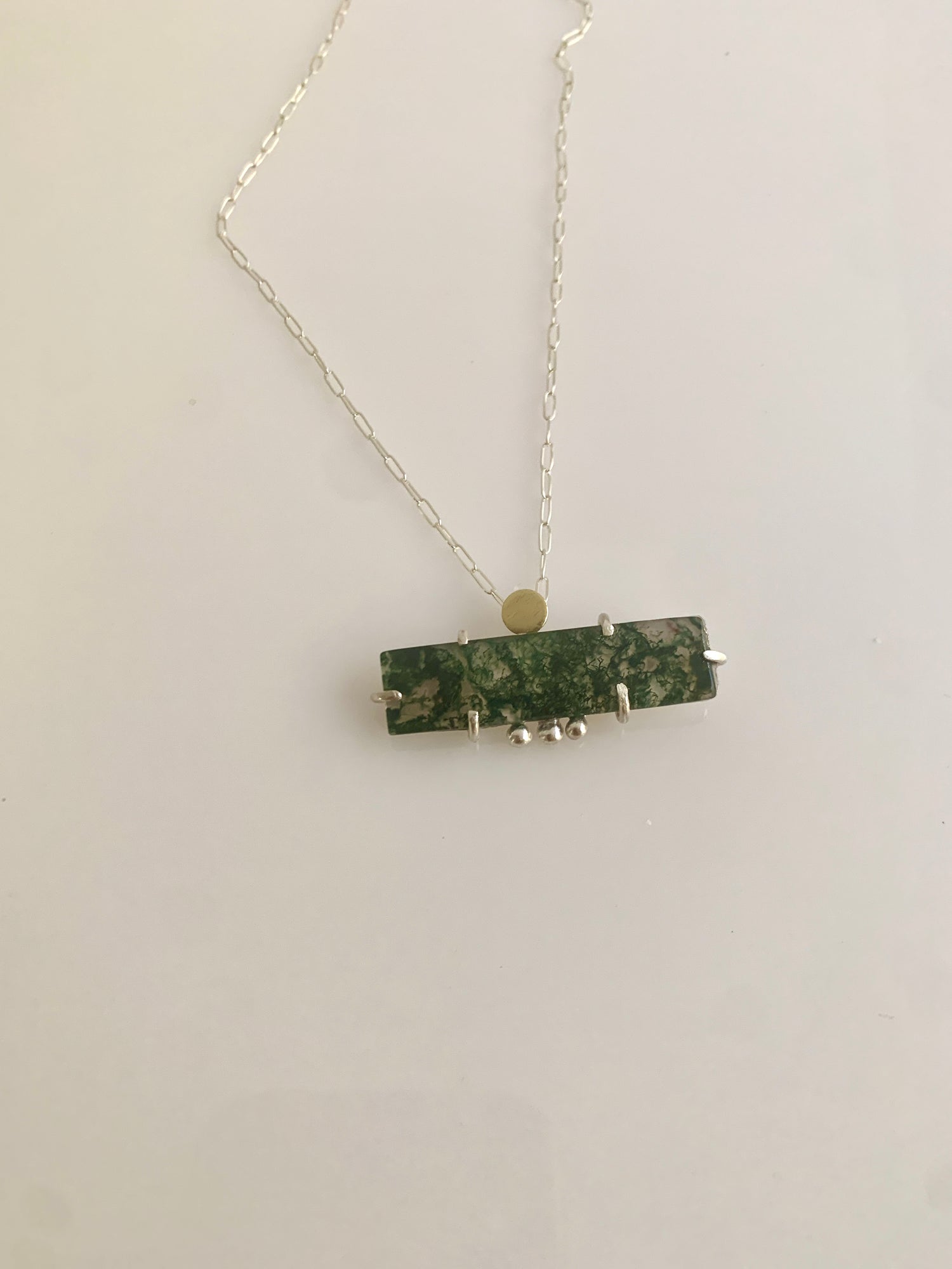 This necklace has rectangular moss agate with brass circle and sterling silver balls, in a sterling silver chain. Delicate and modern - perfect with any outfit and occassion.