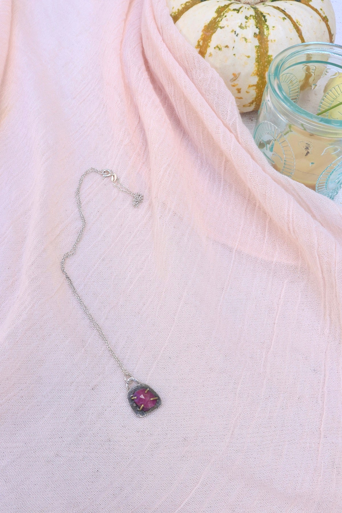 Ruby set in brass prongs with textured and black patina silver. Dainty and eye catching pendant. Comes with silver chain. Lobster clasp.